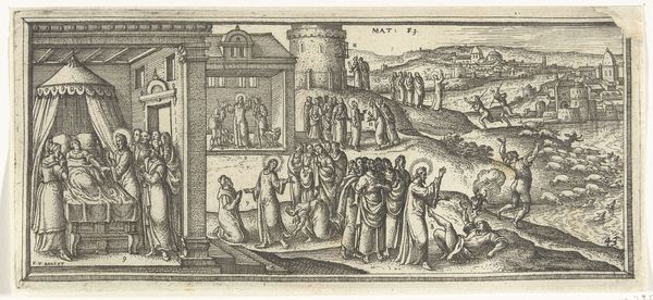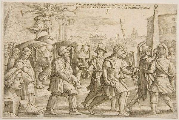 Curator: Take a moment to look at Hendrick Goltzius’ engraving from 1597, “Proces volgt Blinde Begeerte”, which translates to "Process Follows Blind Desire." It's currently held in the Rijksmuseum collection. Editor: My immediate reaction is that it's crowded and unsettling. There’s a bizarre cast of characters leading us into what looks like…hell? The lines are so precise yet the subject matter is disturbing. Curator: Indeed. Goltzius was a master of line and allegory. This engraving employs mannerist conventions with its elongated figures, dynamic composition, and moralizing message. Note how the figures are emerging from a dark cave on the left. It visualizes the ruinous path one takes when pursuing blind desire, symbolized by the figures that lead the procession. Editor: So we have figures representing vices and weaknesses, leading presumably unsuspecting people to their doom. I am intrigued by the figure with the dog’s head in this bizarre parade and the skeleton-esque figure besides him. And leading them along—Cupid wearing what looks like a bucket on his head? It all seems incredibly heavy-handed. Curator: It is dense with symbolism. The dog-headed figure probably alludes to sensual pursuits and the skeleton, clearly mortality—each represents the different faces of earthly temptations. Even Cupid, normally the charming god of love, is weighed down and distorted. The "bucket" is probably a fool’s cap which further signals the irrationality of desire. Editor: The whole thing reads as a cautionary tale, reflecting perhaps, a societal anxiety present in the late 16th century about moral corruption and the dangers of unchecked desires. And it speaks to the Northern Renaissance preoccupation with mortality and moral lessons through art. Curator: Exactly. Goltzius is very deliberately presenting a world where reason and virtue are abandoned in favor of base instincts. The cave symbolizes ignorance. Note how Process, embodying proper legal action and reason, is the last character pictured as the group exits the darkness of the cave. He is barely keeping up as blind desire sprints along the road. Editor: It's a stark warning, visually arresting and quite disturbing even now, centuries later. Though I’m not sure about Goltzius’ subtle and sophisticated treatment. Still, it shows that images, just as much as written texts, could participate in cultural critiques. Curator: I think what captivates me most is how Goltzius distills universal moral lessons through highly specific, culturally-coded symbols. These visual shorthands connect past viewers to contemporary audiences in an unspoken understanding. The symbols are there to guide each viewer as it always has been.