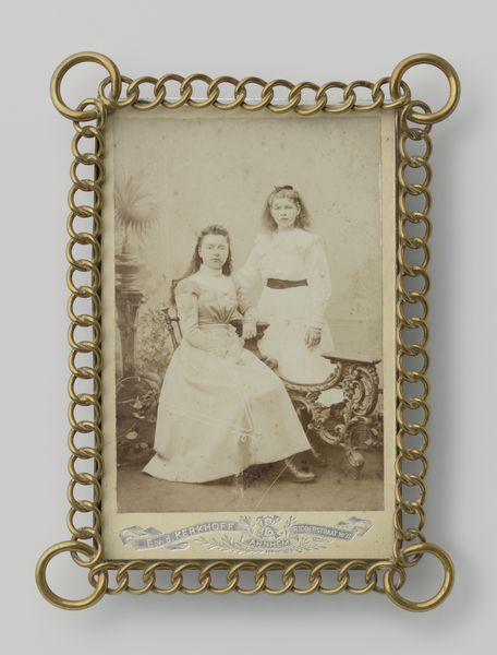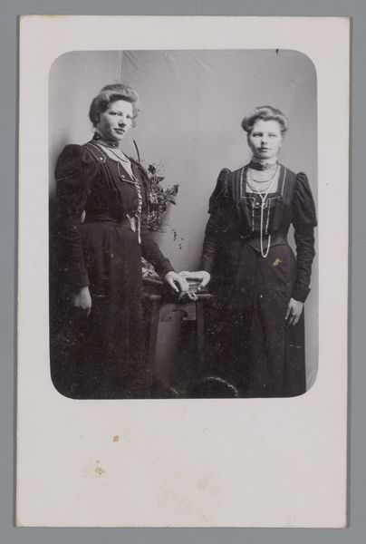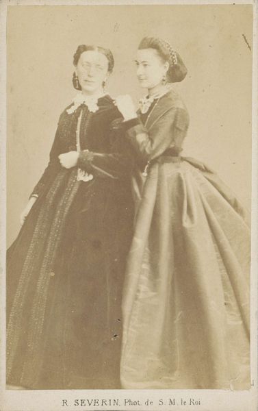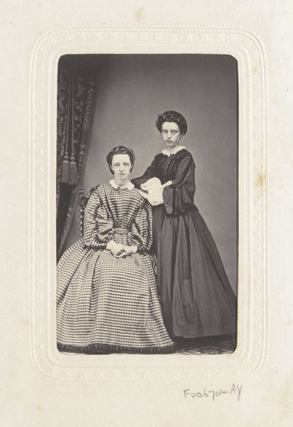 Editor: This is "Portrait of Two Women, Seated at a Table," taken between 1861 and 1874 by Albert Greiner. The tonal range is pretty limited. It makes me wonder, what can you tell us about this work? Curator: This photograph speaks volumes about the emerging technology of image-making and its social impact. Notice the deliberate staging, the rigid poses. Photography was still a laborious process; it wasn't just point and shoot. Editor: Exactly! It must have taken so long to create! Curator: Precisely. Think about the chemical processes, the lengthy exposures. These factors shaped not only the aesthetic but also the cost. Photography democratized portraiture to a degree, yet these women, their clothing, their setting, it indicates a certain social class. Editor: That's interesting. Do you mean that owning photographs was a commodity at the time? Curator: Without a doubt! Photography, at this stage, was a commodity but it gave power to the subject. The women would dictate, to some extent, their own image and circulate that for their own agenda. The clothing, too. It is a symbol of material access, of specific modes of production of the textile industry at the time. Also the creation of a standardized representation of gender roles is highlighted here through dress. Editor: So much to consider with something that, at first glance, seems so simple. Curator: The material conditions always shape the art. That, for me, is where the real meaning lies. Editor: I never would have considered the class implications of photography at that point, or the gendered element of portraying oneself for circulation. Thank you!