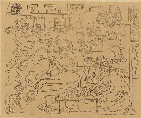 Curator: Look at this whimsical pen and ink drawing; a study for a title page from Punch, Volume 55, dating back to 1868, by Charles Samuel Keene. Editor: Oh, I love the energetic, scratchy lines! It feels spontaneous, like catching a fleeting thought. Is that a play unfolding? Curator: Precisely! It seems to be a rehearsal, a scene from a play with various figures adorned in theatrical costumes, and yes, there’s even a little dog observing from the lower section. Notice the material realities embedded here. The relatively inexpensive nature of pen, ink, and paper democratized image-making, allowing for the rapid dissemination of social commentary through publications like Punch. Editor: The costumes, the stage, even the ink itself – they are all materials performing their roles! It is really cool, each quick stroke loaded with purpose. I can feel the pulse of the theater and the artist's hand. But the composition seems almost... improvised? Curator: Indeed, that seeming improvisation is key to the artwork's success. The visible layering of lines, achieved through cross-hatching with a pen, wasn't about creating something ‘perfect’. It was meant for reproductive techniques. These marks allow it to translate through printing, thus creating wider social availability. Editor: You are right; it really makes you think about the Victorian public absorbing this imagery weekly! And now, viewing this material from today, it's a direct link to their era, you can also make out '68 on the right side. Makes me consider the conversations it stirred in its original setting. Curator: Well said. By appreciating the intersection of materials, labour, and social satire here, one starts to appreciate Keene’s artwork outside the usual restrictive "high art" categories. The essence is about accessibility and critical reflection, captured beautifully by a deceptively simple drawing process. Editor: Right! So much more than just "a drawing," it is a witness to a time, an event, a way of life. Curator: Indeed! So next time you view art, ask: what dialogues are happening? Then look closely: what did the artist use to make the artwork, and perhaps most significantly, who was it meant to be consumed by.