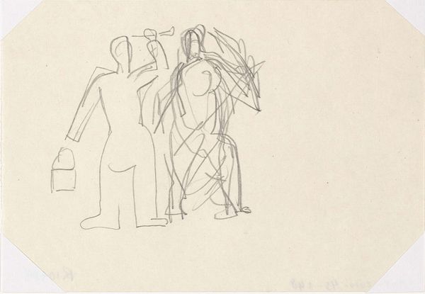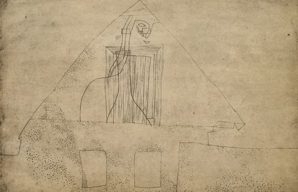 Editor: Here we have Lajos Vajda’s “Madonna above the Gate,” created in ink on paper in 1937. It feels like a ghostly blueprint, layered with religious symbolism. What do you see in this piece, considering its historical context? Curator: I see a fascinating interplay between religious iconography and modernist aesthetics, shaped by the socio-political turbulence of the 1930s. Vajda, positioned in interwar Hungary, presents a fractured Madonna, literally drawn over an architectural space. Considering that artists were often pressured by institutions, do you think he might be trying to say something about the Church’s position in society, or perhaps its relationship to architecture, to the very idea of building? Editor: That's a thought-provoking point. It's as if the spiritual is superimposed, maybe even struggling, against the physical structures. Could this suggest a critique of institutional religion versus personal faith, in a period ripe with societal anxieties? Curator: Precisely. The layering and the fragility of the ink drawing suggest a sense of precariousness. Look at the lettering as well – almost obscured, as if to suggest historical text being forcibly rewritten. What implications could such cultural modifications provoke in terms of public response? Editor: I never noticed the way those cultural layers obscure the spiritual figures, now I see how charged that must have felt to its original audience. I guess even a simple drawing like this holds within it entire social struggles. Curator: Yes, indeed. Even through its modest materials and intimate scale, this artwork echoes the larger societal shifts and contestations of its time. Editor: I've learned a lot about seeing artworks as evidence of their specific histories. Thank you. Curator: My pleasure. It’s important to remember art doesn't exist in a vacuum; it is always in dialogue with its time.