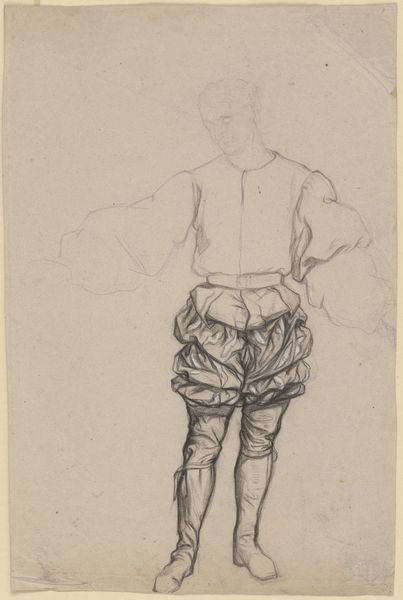Curator: This captivating drawing is "Horatio aus _Hamlet und Horatio_," created around 1868 by Victor Müller. It resides here at the Städel Museum. Drawn with pencil and chalk, the artist captures Horatio with elements of romanticism, almost as a sketchbook study of a figure, the character Horatio no doubt, costumed from Shakespeare’s “Hamlet.” Editor: There's a somber yet elegant feel, isn’t there? The grey paper really underscores the sense of incompleteness as a study. He appears stoic, posed in mid-motion or even contemplation? It suggests to me a quiet dignity amid potential turmoil, reflective perhaps of Hamlet’s own existential dilemma. Curator: That aligns well with the social context in which Müller was creating. Romanticism valued emotionality and the power of individual introspection, responding against the rigidity of societal norms. Victor Müller, known for genre painting and history painting, situated himself within mid-19th century German intellectual life, using Hamlet as source material. It reflects his involvement with the political symbolism inherent in the theatrical staging of the day. Editor: I find it intriguing to consider who was granted access to this characterization, and who decides which narratives about men take on an important place in culture. Was Müller positioning this specific portrayal of Hamlet’s loyal friend in conversation with any of the power dynamics of his moment? The unfinished composition suggests possibilities still in formation, not yet given their total position. Curator: The loose execution style reflects broader shifts occurring within artistic circles during that period. Academic art demanded highly finished and polished surfaces, whereas a younger generation of artists, with artists like Müller, gravitated towards sketches that highlight their working process and the energy of spontaneous creation. So this almost rejects a perfectness within that academic approach. It also makes a break towards looser forms. Editor: This certainly opens up several readings of not only the art's production but also our viewing experience. Perhaps what seems “unfinished” challenges our demand for full or total depictions—allowing space for nuance, mystery, for a figure who holds counsel. Curator: Absolutely. Studying "Horatio aus _Hamlet und Horatio_" deepens our awareness of not only art history itself, but of the political and social currents coursing through mid-19th century German life. Editor: It’s a reminder that even sketches of historical characters are not neutral; they're loaded with potential for reflection about identity, performativity, and historical narration.