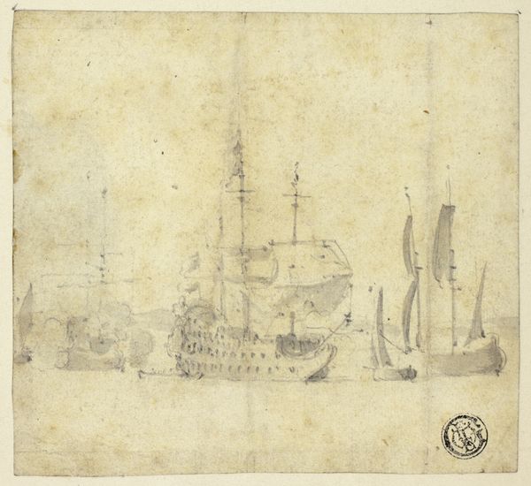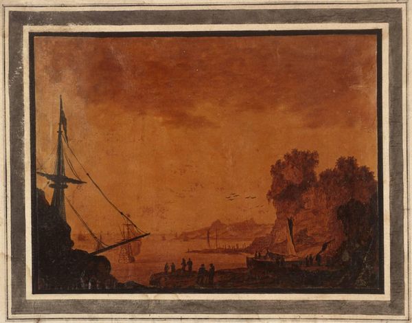 Curator: Alexander Cozens' "Coast Scene with a Ship" is a small-scale work held at the Tate, an evocative glimpse into 18th-century maritime life. Editor: There's an undeniable melancholy in the monochromatic wash—a sense of impermanence, perhaps echoing the transient nature of coastal life itself. Curator: The ship becomes a poignant symbol of trade, yes, but also of colonial ambition and the complex networks of power that shaped the era. How does the symbolism of the sea reflect anxieties around British identity and naval power? Editor: For me, the vessel is representative of a journey—the mast reaching to the sky; a reaching towards something new. The sea evokes feelings of freedom, and a chance at a new life. Curator: Indeed, the relationship between the sublime natural world and human endeavors. Editor: Well, yes, there are certainly multiple interpretations! Ultimately, this piece is a rich visual exploration. Curator: Yes, it provokes thought about the intersection of humanity and the environment.