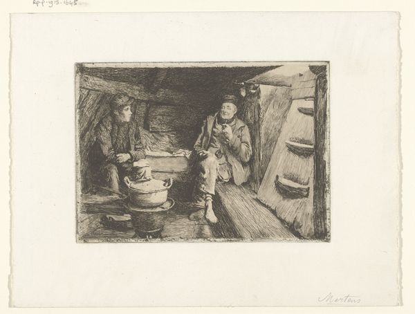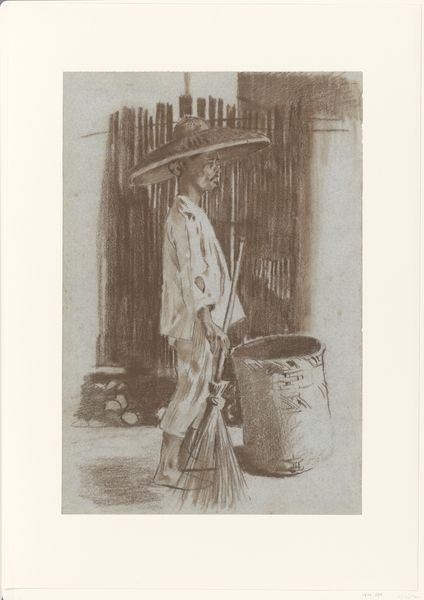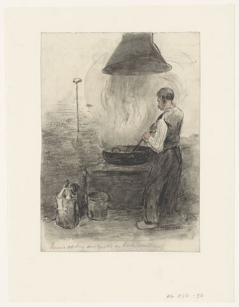 Editor: Here we have "In de katoenververij" – or "In the cotton dyeing mill" – a pencil drawing by Anthon Gerhard Alexander van Rappard, created sometime between 1868 and 1892. The subject matter has a stark, industrial feel. What's your read on the symbolic weight of such a scene? Curator: The setting itself, a cotton dyeing mill, speaks volumes. What was being produced there? More than likely, cloth meant for export, for sale. Consider the layers of meaning: raw material transformed into a commodity through human labor. A commodity then sold for profit... does this chain hold an implicit cultural narrative? Editor: It’s interesting to think of the image not just showing a scene, but embedding this idea of global trade networks. It's pretty subtle but thought provoking! Can we unpack some other possible meanings? Curator: Note how the figure is positioned – slightly turned away, head bowed. Is there a sense of anonymity? Van Rappard seems interested in a social commentary: the representation of labor, yes, but possibly also of alienation? Does the lack of light, coupled with all those tubs, contribute to such feelings? Editor: It does evoke those feelings. I was only considering the aesthetic at first but there’s more depth than meets the eye, definitely! Curator: The choice of subject and medium can offer insight into the artist's message. What emotions or ideas would the viewer carry away? This work allows a tangible connection with labor and industry's rise at that time. Editor: That's very true, you've broadened my perspective to seeing the cultural story held within what seemed a simple sketch. Curator: Likewise. Considering all of the symbolic potential enriches the experience so very much.