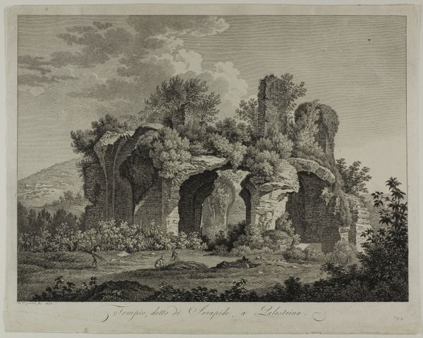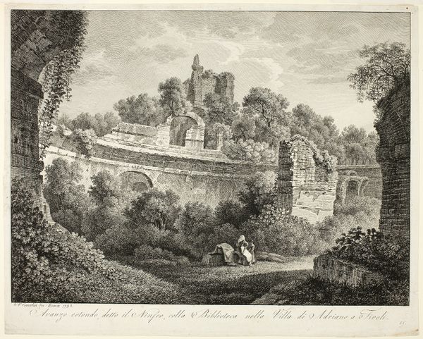 Editor: This is Johann Christian Reinhart's "Ruins of the Villa of Publius Ventidius Bassus at Tivoli." It's a scene of ancient ruins, but rendered in such precise detail. What do you see in this print? Curator: I see a deliberate engagement with the material reality of the past. Reinhart meticulously documents the decay – the weathering of the stones, the overgrowth of vegetation. Notice the labor involved in quarrying and construction, now reclaimed by nature. What does this juxtaposition suggest to you about the social context of the time? Editor: I suppose it speaks to the power of nature to outlast human endeavor, but also maybe to a changing social structure where these grand villas are no longer maintained. Curator: Precisely! And consider the consumption of such images. Who would purchase this? What kind of meaning would they derive from contemplating the labor now in ruins? Editor: It’s interesting to think about the artwork in terms of its creation, its subject, and its later consumption. Thanks!