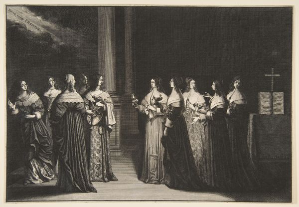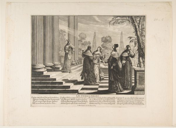 Abraham Bosse created this print, "The Wise Virgins Refuse Oil to the Foolish Virgins," using engraving techniques. The composition is structured around a stark contrast of light and shadow, immediately drawing our eyes to the central figures. Notice the formal arrangement: On one side, the "wise virgins" are depicted in a tight, contained group. On the other, their counterparts are scattered, visually suggesting disarray. This contrast extends beyond mere depiction, serving as a semiotic marker for themes of readiness versus unpreparedness. Bosse’s strategic use of line and space creates a visual language that reinforces the narrative’s moral structure. The architectural elements also play a crucial role. The imposing column and altar serve not only as a backdrop but also as structural components that reinforce the themes of order and divine judgment. This isn't just a story; it's a carefully constructed visual argument about virtue, preparedness, and the consequences of their absence.