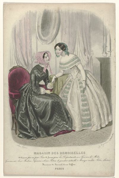 Curator: Let's consider this print, "Allgemeinen Musterzeitung, Beilage zur allgemeinen Musterzeitung, 1 april 1855," which translates to something like 'General Pattern Newspaper, Supplement to the General Pattern Newspaper, April 1st, 1855.' Editor: Immediately, the clothing screams mid-19th century. There’s something somber about it too, despite the elegant fashions. It makes me think about social restrictions and the expectations placed upon women at the time. Curator: Absolutely. These types of fashion plates were prevalent; essentially distributed to dressmakers or potential customers to keep up with the latest styles and fabrics. Note the detail in the engraving of the layered fabrics, the puffed sleeves. One could trace the labor back to textile mills, dye production, pattern-making… it all represents a complex system of production and consumption. Editor: Precisely! We’re looking at more than just aesthetics. Who was being marketed to, who had the resources to acquire such clothing, and what messages were these styles conveying about status and conformity? The central figure’s gown and the nun’s habit speak to divergent roles society deemed acceptable for women: marriage, piety, seclusion... The composition itself directs our attention towards how constrained each figure is, caught in her designated orbit. Curator: It’s a fascinating convergence. Genre-painting blended with commercial pattern illustration. We can investigate the standardization and industrialization occurring through printing. Examining these prints reveals networks of workshops. These objects speak not only to consumer culture, but also illustrate the infrastructure surrounding fashion. Editor: And how deeply it permeated lives! These patterns and ideals dictated movement, self-expression… This plate is a document of social performance—the carefully constructed identity being presented. Think of how confining those silhouettes are physically and metaphorically. What narratives are missed as a result of it all? Curator: In essence, scrutinizing material culture leads into discussions about production, societal roles and the commodification of aspiration, captured here on a mass-produced paper. Editor: A tiny lens through which we see power dynamics subtly imposed in day to day. The very constraints become evidence, speaking loudly across history.
