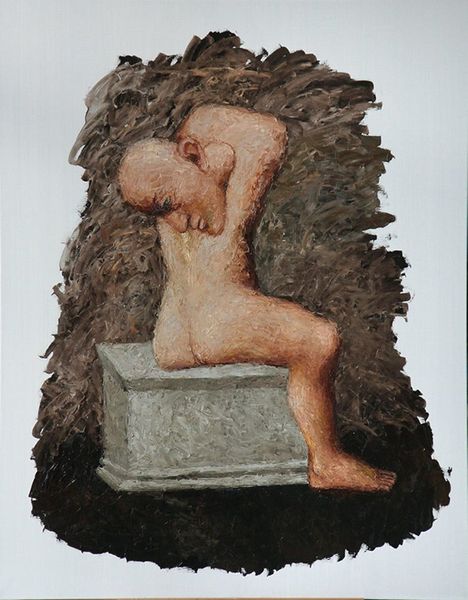 Alexander Roitburd created "Feast of the Rosary" using oil on canvas. Roitburd’s artistic journey was deeply intertwined with Ukraine's turbulent transition after the collapse of the Soviet Union. In this stark painting, two nude female figures stand face to face, connected by an abstract, arching form above their heads. Their gaze suggests a silent exchange or confrontation, a negotiation of shared space and perhaps shared identity. Their bodies, rendered with raw honesty, seem vulnerable, set against a muted background, which adds to the piece's emotional weight. Roitburd, who was also an activist, consistently challenged the norms of both the Soviet and post-Soviet art scenes. His works often explore themes of cultural identity, political commentary, and the human condition, inviting viewers to question the established narratives and power structures. The artwork serves as a mirror reflecting not only personal experiences but also broader societal struggles of those living in times of conflict.