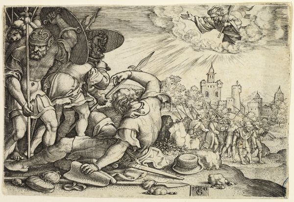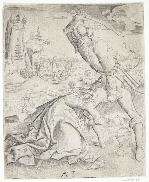 According to legend, the nobleman Dioscurus was so afraid that a suitor would captivate his beloved daughter Barbara that he shut her away in a tower. She managed to convert to Christianity by corresponding with a teacher in Alexandria, which infuriated her father, who was a heathen. As punishment he cut off her head, a fate that Master MZ shows her enduring with a martyr's grace. This print demonstrates the peculiarities that scholars invariably associate with his work, including oddities of scale and stiff, awkward poses.