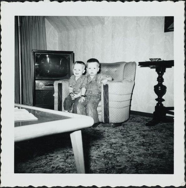 Curator: What a photograph! The textures alone grab me: the soft carpet, the smooth, almost eerily perfect face of the puppet, and the rough wood of the dresser all rendered in stark monochrome. Editor: It's Mary Frey's "Boy with Puppet," part of her series focused on the construction of identity in suburban America. It’s a loaded image, brimming with the complexities of childhood and representation. Curator: Absolutely. The formal composition emphasizes the puppet's unsettling gaze, drawing our attention to the blurred lines between the real and the artificial. Editor: And consider the backdrop: a typical boy's room, a space of both comfort and confinement. The puppet, a symbol of control, hints at the societal expectations imposed on young boys. It raises questions about performativity and authenticity. Curator: The composition, even with the open drawer, gives a clear, direct reading and the framing is so balanced that the narrative is immediately accessible to most people. Editor: It really encapsulates a moment rife with hidden narratives. The boy, the puppet, their shared space—it speaks to a wider commentary on constructed realities. I think I need a minute to process. Curator: Exactly! It’s such a subtle yet strong example of how close observation can create emotional and intellectual distance.