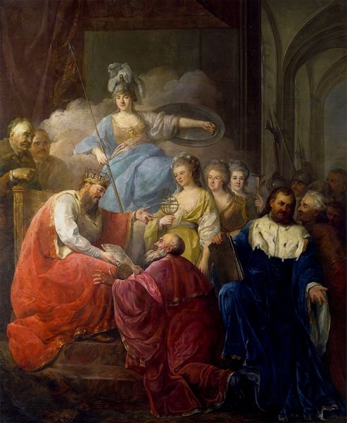Editor: So here we have “The Fainting of Esther,” an oil painting by Jean-François de Troy. It looks like quite a dramatic scene; there’s a figure swooning in the foreground, surrounded by people looking worried in what looks to be a palatial space. It reminds me of history paintings I've studied, but somehow more charged. What exactly am I looking at here? Curator: Indeed, the drama is palpable, isn’t it? De Troy, bless his heart, really knew how to stage a scene! What you’re seeing is Esther, from the Old Testament, revealing her Jewish identity to her husband, King Ahasuerus of Persia, thus saving her people from annihilation. It’s a power play veiled in…well, fainting! Notice how her body is almost doll-like, and yet, she’s the lynchpin of everything happening. Do you get a sense of how de Troy used light here, almost like a spotlight on her? Editor: It's like theatrical lighting, everything does come forward! It’s interesting that she’s the powerful one when she appears to be so...powerless. The king seems concerned, almost impotent by comparison. Was that intentional? Curator: Oh, absolutely! Think about it: Baroque art loved this kind of tension. Esther's 'weakness' is her strength, her courage in that moment is everything. What I adore most is how de Troy captured the before-and-after in a single frozen moment. Do you feel the sense of unfolding narrative? It’s almost like he's giving us a filmstrip distilled into one image. Editor: Now that you point it out, it definitely feels like a specific, charged moment. There is a story there. It makes me think about the power dynamics between men and women that run through Western art…Thanks! I learned a lot! Curator: And I in turn learned, or rather re-discovered, the sheer force a simple faint can hold in the world of painting. Art always reveals new depths, doesn't it?