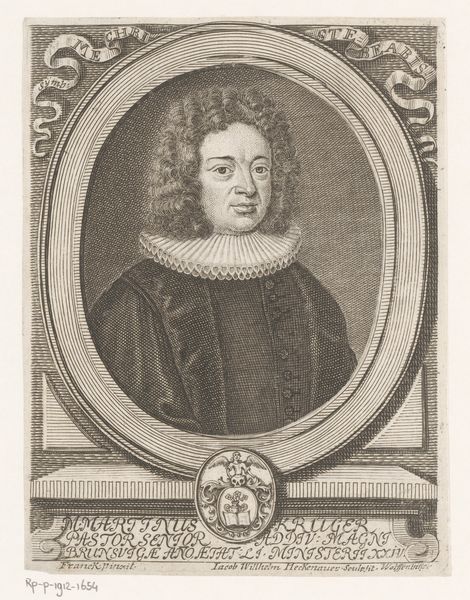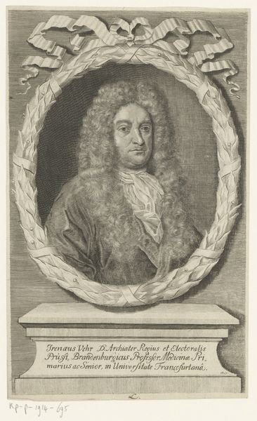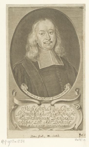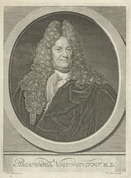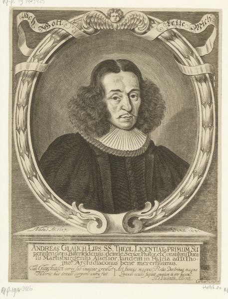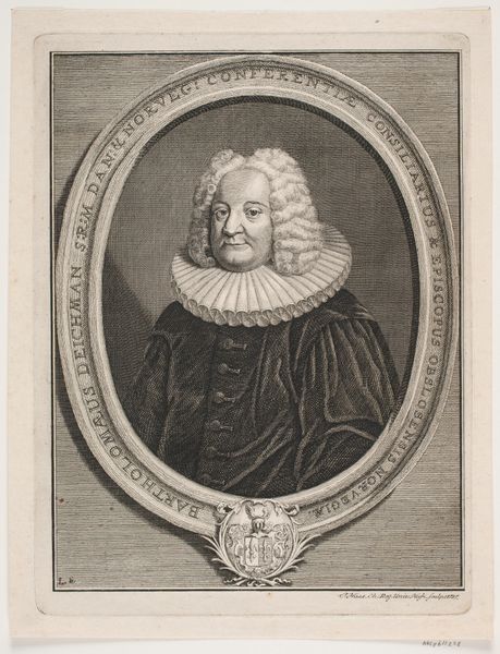 Curator: It has the air of peering into the past, doesn’t it? It feels like one of those old photographs your grandmother keeps tucked away in an album, the kind you find strangely compelling. Editor: This engraving is a portrait of William Sherlock, created sometime between 1721 and 1771 by Johann David Schleuen the First. The print, residing here at the Rijksmuseum, presents an intriguing example of 18th-century portraiture. Curator: Interesting! An engraving, so like a captured shadow rendered in fine lines. I am taken by that oval frame; ornate but enclosing. Does it feel to you like it’s holding the man captive, preserving his essence in this precise moment? Editor: In a way, that frame represents the societal structures within which Sherlock operated. As the inscription notes, he was no ordinary man—a Doctor of Scripture, Rector of St. Paul's, and royal court preacher in London. The frame, like his societal position, sets him apart. Curator: Royal court preacher…So he carried not just spiritual, but also considerable political weight. Makes you wonder how that affected the message he preached. Was he a firebrand, a comforter, or a shrewd negotiator, weaving threads of faith and diplomacy? Editor: Such positions in the 18th century were, indeed, deeply enmeshed with political power. Engravings like these played a crucial role in disseminating images of influential figures, crafting public perception and solidifying their authority. Think of it as early public relations. Curator: Public relations in ink and shadow, I like that! And seeing it now, I note an angel motif embellishes the top of the frame, as if lending the portrait a touch of heavenly approval. Sly. Editor: It speaks volumes about the relationship between religious institutions, the monarchy, and the visual arts during that era. It all highlights how images like this reinforced hierarchies of power and faith. Curator: Thinking of this image in reproduction... Did people seek copies for their homes to broadcast their association, aspiration, respect? Or was it simply that ‘having your portrait engraved’ signified achievement and permanence? Editor: Both, likely! Portraits like these served as aspirational emblems of status, while simultaneously offering a form of symbolic immortality, a way for individuals to transcend their temporal existence. Curator: A memento mori then, repackaged as status symbol. Our friend Sherlock, preserved for posterity. How fascinating it is that this simple engraving continues to spark contemplation, centuries on. Editor: Precisely! It invites us to consider the interplay of power, image, and representation, reminding us that even seemingly simple portraits are imbued with complex cultural significance.