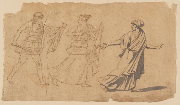 Here we see a study of standing men in togas, made by Peter Paul Rubens, likely in the early 17th century, using pen and brown ink on paper. The fluid lines suggest the artist worked quickly, capturing the essence of the figures with minimal strokes. The ink, likely iron gall, would have been made by hand in a complex process involving fermentation and careful mixing. The paper too, would have been hand-made from linen or cotton rags. Rubens was deeply engaged with the material culture of his time, sourcing pigments, supports, and tools from a vast network of suppliers and collaborators. Drawing, for Rubens, was a fundamental practice, crucial for developing his ideas, and experimenting with composition. In this study, the artist seems especially interested in how the draped fabric falls and folds around the figures. Recognizing the skill and labor involved in this seemingly simple sketch helps us appreciate Rubens's mastery, and the broader context of artistic production in the Baroque era, when the value of both raw materials and artisanal skill was extremely high.
