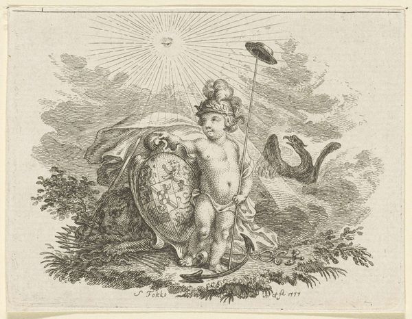 This print, made by Cornelis van Dalen II, depicts a cherubic child amidst swirling clouds, playfully blowing bubbles. This is an allegory of air, of "Aer" as the inscription tells us. Bubbles, ephemeral and iridescent, have long served as symbols of the transience of life. From ancient vanitas paintings, reminding us of our mortality, to Dutch Golden Age art, where they signify the fleeting nature of earthly pleasures, bubbles are visual metaphors. The cherub itself, a figure drawn from classical antiquity and Christian art, represents innocence and divine love. These putti can be traced back to ancient Roman depictions of Cupid, the god of love, who was often portrayed as a chubby child, and evokes a sense of nostalgia, reminding us of a lost golden age. The image taps into our collective memory, evoking a sense of melancholy, for this understanding of the ephemeral is deeply ingrained in the human psyche. This is a symbolic language that transcends time.