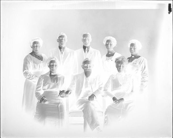 Editor: This intriguing photographic negative, "Untitled (group portrait)" by Hamblin Studio, presents a stark image. The reversal of tones creates an almost ghostly effect. What can you tell me about the materiality and production of a piece like this? Curator: The photographic negative, itself a product of specific chemical processes and labor, becomes the artwork. The labor involved in creating the chemicals, operating the camera, and developing the image are all part of the work’s context. Editor: So it's not just about the people depicted? Curator: Not at all. The means of production—the studio, the equipment, the photographic process itself—are equally important in understanding the image and its place in society. It transforms our understanding of portraiture. Editor: I never thought about it that way. Curator: Considering the material and its making can unlock new perspectives!