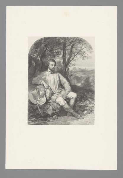 Curator: Charles Monginot’s etching from 1881, "Hunter with Dead Hare," is rendered in fine detail on paper. It depicts a seated man cradling his kill. What strikes you most upon viewing it? Editor: There's a strange tenderness despite the violence implicit in the title. The rough strokes making up his clothing hint at coarse material, while the dead hare seems oddly nestled in his arms. There’s a contrast that interests me immediately. Curator: Yes, the imagery presents a stark duality. The hare, a symbol of vulnerability and swiftness, is juxtaposed with the hunter, who embodies dominion and earthly necessity. The setting also plays a part; note the dense undergrowth rendered with frenetic marks behind the figure. Editor: You're right. The etching style, all those frantic lines, contribute to the feeling of the hunter being embedded *within* his environment, almost one with it. What was Monginot saying about this relationship? About what is consumed and what does the consuming? I'm curious about the paper; is it laid or wove? Curator: That’s key: consider also that rabbits and hares often signify abundance and cycles of life. Here, the dead hare isn't just a prize but represents mortality's interruption of those natural rhythms, both ecological and existential. Monginot's choice to depict this through etching, a method that requires repeated immersion and acid’s “biting” action on the metal plate, suggests a prolonged and somewhat torturous artistic engagement. Editor: Interesting point about the etching process mirroring a kind of extended engagement with death. It makes me think about who produced this paper in 1881? How would its production and circulation be linked to notions of resource management and the societal role of the hunter figure in this context? Curator: Those are pertinent questions indeed. I think the beauty of this lies not just in its immediate visual impact, but in how it makes us contemplate the tangled web of life, death, and representation across cultures. Editor: And for me, considering its materiality allows me to delve more into social relationships connected to consumption, labor and resources, highlighting Monginot's complex portrait of rural life. Thank you!