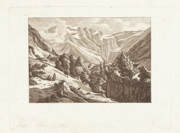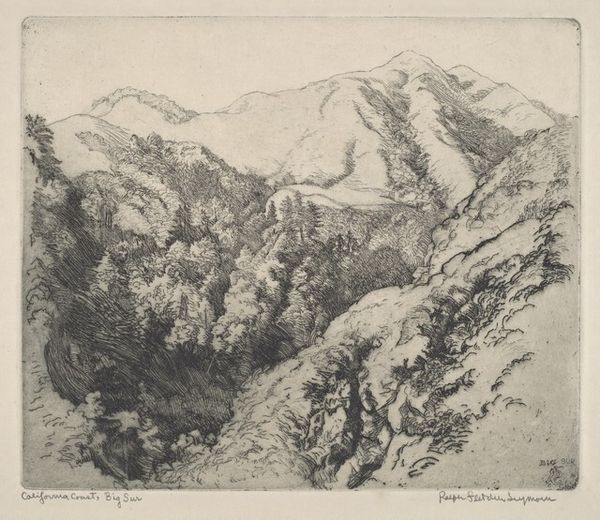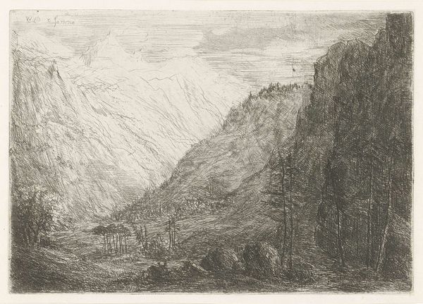 Editor: Here we have Pierre Louis Dubourcq’s "Rocky Landscape with Waterfall," created sometime between 1830 and 1858, using etching and engraving. The details created with the stark monochrome really capture the rushing power of nature. What’s your take on it? Curator: The image certainly presents a picturesque scene, but what strikes me is how the processes of etching and engraving are deployed. Consider the labor involved in meticulously creating those lines, replicating a natural scene for consumption. Do you see how the "realism" isn't just about the subject, but about making nature reproducible? Editor: So you’re saying that the artistry is not simply imitating nature, but in the work needed to create a printed representation that can be distributed? Curator: Precisely. This etching allows the "experience" of nature, or rather a particular aesthetic ideal of nature, to become a commodity. The artist’s labour, and the material constraints of printmaking become essential parts of its meaning. Think about how the distribution changes the perception. Editor: I hadn't considered it in that way, I was caught up in the image itself, but the choice of the materials is a message in itself. Thanks. Curator: And the distribution network, and the economy it feeds, also must be factored in to the conversation.
