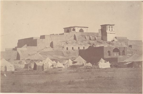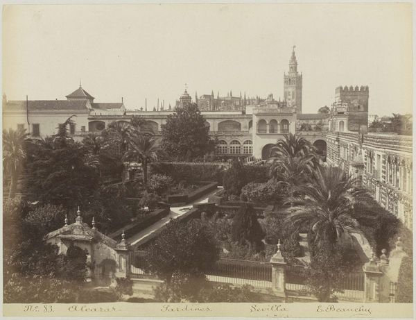 Editor: This albumen print, “Gezicht op een ommuurde stad met poort, mogelijk Tétouan,” made sometime between 1880 and 1910 by Antonio Cavilla, has an intriguing sense of depth. The vegetation in the foreground almost obscures the city walls, drawing my eye toward that central archway. What symbols or cultural memories are embedded in this seemingly simple landscape? Curator: This photograph, an example of Orientalism, reveals as much about the photographer's perspective as it does about the place itself. Note how the archway you mentioned, with its subtle Islamic design, punctuates the imposing wall. Consider that walls and gateways are potent symbols across cultures. What do they signify here, do you think? Editor: Hmmm…Protection, obviously, maybe even separation, both physically and culturally? The framing does seem to emphasize a divide. Curator: Precisely. The very act of photographing this walled city frames it for a Western audience, perhaps reinforcing notions of the "other." Also, observe the minaret in the background, subtly hinting at the city's identity and spirituality. This evokes a connection between earth and sky and may also have acted as a marker for trade routes across the desert and into Europe. These photographic expeditions become a way of claiming visual possession, translating lived experience through a specific cultural lens. It really makes one consider photography's role in constructing perceptions. Editor: I never considered it from that angle. So, by photographing these specific elements—the wall, the arch, the minaret—Cavilla wasn't just capturing a scene, but constructing a narrative about Tetouan, potentially influenced by prevalent Orientalist views of the time. I appreciate your pointing out the symbolic weight carried in these structures, like the wall acting as a metaphor itself! Curator: Exactly! It demonstrates how visual language, consciously or unconsciously, transmits and perpetuates cultural memory.