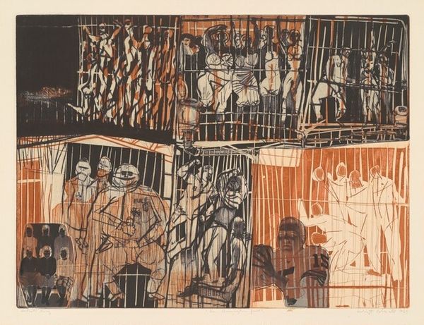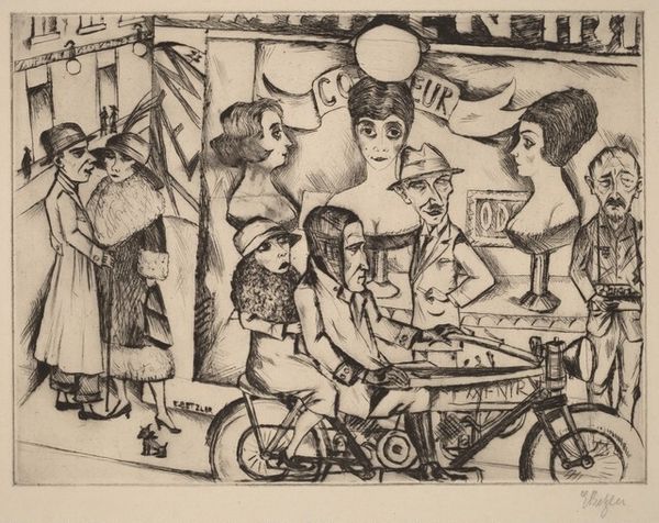 Editor: This graphite drawing, "Promised Land" by Nan Lurie, made sometime between 1935 and 1943, seems to depict a bustling cityscape. There is an interesting tension between the crowded composition and the seemingly detached figures. How do you interpret this work? Curator: Considering Lurie’s possible affiliation with the Ashcan School, I view it as a critique of the very materials that constitute its subject matter. Lurie uses readily available, inexpensive graphite and printmaking techniques to depict a landscape dominated by advertising. This choice subtly exposes the link between artistic production, mass consumerism and the urban spectacle during the depression era. Editor: I hadn’t considered that. So, the drawing materials themselves are making a statement? Curator: Exactly. The drawing material, easily mass-produced and accessible, mimics the ubiquity of advertising signs that promote an empty promise of enjoyment and luxury. The layering of ink and graphite seems to visually mimic the overstimulation of an urban environment. Editor: It’s almost as if the medium is the message about how relentless consumerism seeps into our daily experiences. The chaotic overlapping in the composition amplifies that. Curator: Precisely. And, think about how the printmaking process, used to replicate the image, reflects the mass dissemination of the advertisements depicted. The materiality becomes intrinsically linked to the message about capitalist excess and the unfulfilled promises within a rapidly changing society. What do you think the location suggests? Editor: I would not have picked up on these critical choices relating to its method without your expertise! I notice the ‘hull’ advertisement repeatedly; maybe this is somewhere like Kingston-Upon-Hull? That’s interesting, because Hull had serious socio-economic problems due to it being de-industrialised at the time. Curator: Interesting. I had not known the details about Hull, but your insight is very much in line with a materialist analysis. Thanks for teaching me something! Editor: Thanks to you as well. I appreciate the deeper connection you made to the context.