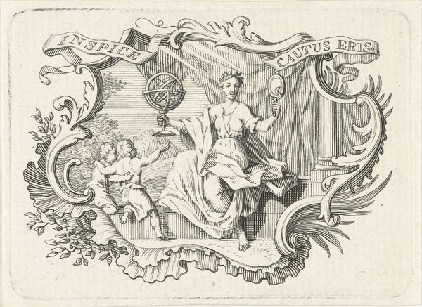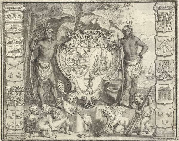 Editor: Here we have Jacob Folkema's "Wapenschild geflankeerd door putti," an engraving dating from 1723-1767. The detail achieved through the engraving technique is remarkable, almost tactile. What significance do you see in this specific choice of printmaking? Curator: Well, considering this was likely a mass-produced item, possibly intended to commemorate a family or event, the engraving medium becomes really interesting. It allows for relatively easy reproduction, embedding the depicted family into a wider material and social network. It wasn't about individual artistry as much as creating a standardized object for consumption. Editor: So, the choice of engraving shifts the focus from artistic expression to broader social and economic contexts? Curator: Precisely! Think about the labour involved: the engraver meticulously translating an image onto a plate, the printing process itself, and the distribution. These prints democratized access to heraldry, previously only held by the very wealthiest, albeit on a very small scale. How might the relatively accessible materiality of this print impacted public perception of nobility? Editor: That's fascinating. It reframes how we view "art" – not as an exclusive object, but as a product of labor and a tool for social positioning. Curator: Exactly. And by examining the material reality of its creation, distribution, and consumption, we can gain a richer understanding of the era's values and the ever-evolving relationship between art, labour, and class. It helps to reveal the means of production behind these symbolic items. Editor: I’ve certainly learned to look at engravings through a new lens, valuing not just the imagery, but the entire material ecosystem that supports it.