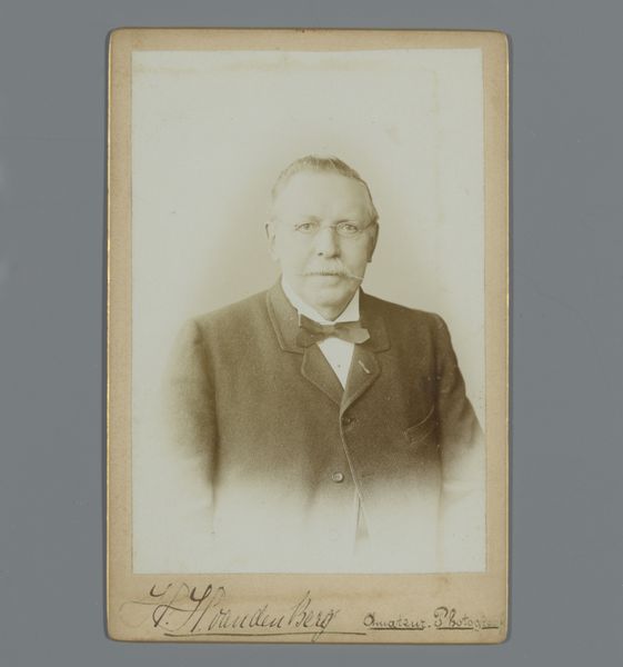 Curator: Let’s turn our attention to "Portret van Pieter Caland," created in 1876 by Maurits Verveer. Editor: My first thought is of the palpable texture and surface quality, especially within the tight constraints of the oval format. You can almost feel the layers of the photographic emulsion and the matte surface of the cardboard backing. It has this almost tangible materiality. Curator: Indeed, Verveer's mastery lies in capturing tonal variations using photography. Note how the sitter’s dark suit contrasts sharply with the softer lighting of his face. It almost imbues Caland with a sculptural presence, wouldn’t you agree? Editor: Perhaps. But that formal reading also highlights the social function of photography in that period—reproducing and distributing images as tools to solidify the bourgeoise identity. Look at the precision in rendering his garments—the starched collar, the neat bow tie—symbols of an emerging middle-class striving for status and recognition through representational art. The studio must have employed meticulous labor in the processes of staging and photographic development. Curator: An intriguing point. One might also appreciate how Verveer guides our focus through a sophisticated interplay of light and shadow—it moves from Caland's intense gaze to his carefully groomed facial hair, echoing similar features we find within classic paintings of that era, or even the early modernist period. Editor: And I'd emphasize the photographic process itself! Silver halide crystals meticulously exposed and developed on a treated surface – revealing the tangible and material realities of bourgeois identity through an evolving photographic industry. Curator: True; there's an undeniable tension, and interplay, between the represented subject and the very means of his representation, perfectly capturing this key point of modern industrial production. Editor: Exactly, from this material view, it’s clear that portraiture, like that of Pieter Caland’s, served as an efficient device. It reinforced the notions of progress through capital, material advancements and visible signs of distinction and recognition in modern industrialized societies. Curator: Yes, looking at the subtle light modulations across Caland's visage reminds me of the lasting visual languages in play within artistic expression; quite striking! Editor: Examining the photographic materials themselves, we see art deeply embedded in the processes of material and class-based cultural creation. A revealing combination of both image and method that the artist has skillfully deployed.