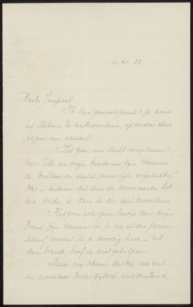 Curator: So, we have here "Brief aan Philip Zilcken," a drawing possibly from 1929, by A. de Haas, done in ink on paper. It looks like a handwritten letter. What are your initial thoughts? Editor: It feels incredibly personal, like a glimpse into a private moment. The script gives it an intimate feeling, and the fact that it's hand-drawn makes it seem very fragile and delicate. I’m curious about its purpose. How do you interpret this work, and what might it reveal about the relationship between the artist and Philip Zilcken? Curator: That feeling of intimacy is key. Think about the act of letter writing in the early 20th century, before digital communication. Letters were powerful tools for forging relationships, disseminating ideas, and preserving history. As a 'brief,' or letter, it is positioned within a historical discourse, so who were these figures, and what can the intersectional analyses of class, gender, race and politics say about the discourse that defines this space? The gestural nature of handwriting conveys emotion and presence in a way that typed text often can’t. This letter embodies a form of activism because written correspondence allowed individuals to transcend geographical boundaries and express themselves within restrictive socio-political environments. What aspects of identity and power dynamics are revealed by the letter's content and tone? Editor: That's a good point; handwritten text definitely has more… weight. So the choice to send this information as a letter, versus another medium, shows something in and of itself? Curator: Precisely. De Haas isn't just conveying information; they're constructing an identity and a relationship. How does the very act of handwriting, the choice of language, contribute to a performance of self and solidify their personal and political intentions? How do we deconstruct what it may say in terms of social context, or their individual status? Editor: I hadn't considered the performative aspect of it before. I see now it isn't just what the letter says but how it says it. Curator: Exactly! It underscores the agency inherent in the written word, particularly in historical contexts where access to communication channels was limited. Understanding this helps us appreciate how art, even in a seemingly simple form like a letter, can challenge power structures and contribute to social change. Editor: That's fascinating! I’ll definitely look at letters and other text-based art differently now.