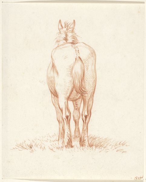 Curator: Looking at Moses ter Borch’s “Horse with Knotted Tail, from Behind,” dating back to about 1660 and currently held at the Rijksmuseum… I find myself strangely captivated by its… posterior. Editor: Yes, intriguing! There's a stark simplicity. It feels incredibly grounded, solid. Like a monument, but made delicate by the pencil strokes. It's like Ter Borch is saying something important about… well, the back end of a horse! Curator: Precisely. The choice to focus on the form, specifically from this perspective, prompts reflection. The knotted tail, for instance, might suggest domestication, control, but also perhaps a certain aesthetic sensibility of the time. It reminds me a bit of formal portraiture, stripping away the usual markers of status and focusing instead on the animal itself. Editor: That's it! Knotted tails weren't uncommon, signifying work animals—draft horses. This isn't some pampered steed; it’s a worker. The knot is also fascinating. We control animals, manipulate their images, project fantasies of ourselves upon them. Curator: It is, quite literally, an image of service. Consider, too, the Dutch Golden Age context – a time of great wealth built in no small part on animal labour and agriculture. It really feels like the artist wants us to meditate on the labor required to build that prosperity. A meditation on the back of an animal quietly going about its duties, away from grand narratives. Editor: I see that visual pun. Maybe he wanted to bring awareness to what enables greatness—the 'behind-the-scenes' work often forgotten. Great art can reveal the mundane as profound. Curator: And reveal it with a deceptive lightness. Ter Borch uses these minimal lines to create such palpable volume. One could get lost in the subtle shading suggesting form, muscle, weight… and just like that, from the rear of the horse we find our front seat in contemplation. Editor: Beautifully put. Ultimately, I'm taking away this quiet image of an era of animal work in the Netherlands. Its power, even today, reveals the rich legacy left to interpretation in those delicate lines.