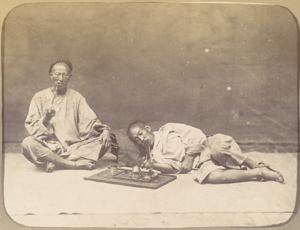 Curator: Willoughby Wallace Hooper’s “Untitled (juggler swallowing a sword)” is a curious albumen silver print from the late 19th century, currently residing at the Harvard Art Museums. What strikes you first? Editor: A kind of serene horror. The man’s posture is so composed, almost meditative, despite the rather alarming object protruding from his mouth. Curator: Absolutely. The sword, or dagger, can be seen as a symbol of transcendence, of pushing beyond perceived limitations. It speaks of mastery over the physical. Editor: I also think about vulnerability. The exposed chest, the way the light catches his skin… it reveals a fragility that contrasts sharply with the act itself. It’s a paradox, this image. Curator: Yes, and that paradox is precisely where the power lies, isn’t it? It’s a reminder that even in seeming control, we're always teetering on the edge of something quite unknown. Editor: A potent dance between strength and surrender. It's certainly left me with a lot to contemplate. Curator: Indeed. It's a rather unforgettable image.
