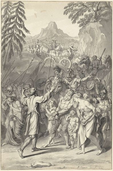 Cornelis Huyberts created this print, "Moses and the Bronze Serpent," sometime between 1669 and 1712. Note how Huyberts orchestrates the scene around a stark vertical axis, drawing our gaze upwards from the writhing figures to the serenity of the serpent on the pole. This is not merely a narrative illustration but a structured field of contrasting energies. The dying figures at the base, rendered with dramatic diagonals and foreshortening, embody chaos and suffering. This is sharply juxtaposed with the orderly ranks of onlookers and Moses himself, whose raised arms form another vertical, framing the image and lending a sense of divine order. Here, the serpent becomes a signifier, destabilizing its traditional association with evil. Instead, it offers salvation, a visual paradox that invites us to question fixed meanings. The composition encourages a reading where salvation isn't passively received but actively sought, demanding a shift in perspective from earthly chaos to divine order.