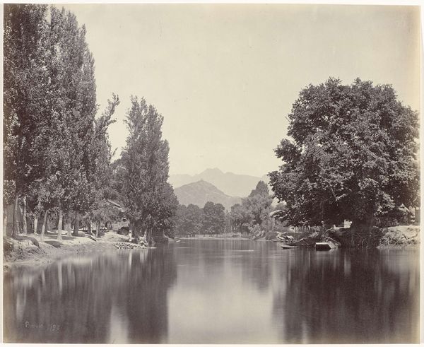 Editor: This is "View from Koong-Yan-Shang Temple," a photograph taken by John Thomson in 1869. It's a strikingly calm landscape, almost dreamlike in its monochrome tones. What do you see when you look at it? Curator: Immediately, I see the enduring symbols of Chinese landscape painting: the mountains as metaphors for strength and permanence, the water representing fluidity and change. The boat carries heavy weight. What does it signify? Perhaps a journey, or the individual's place within a larger world. Does it conjure any cultural memory for you? Editor: It makes me think about the literati paintings we studied. I can almost feel the artist's presence, contemplating the scene. How does Thomson's photography engage with that tradition? Curator: Precisely! Photography here isn't just documentation. Consider the framing, the tonal range… Thomson is using a modern medium to participate in a centuries-old visual language. He captures a specific place, but also evokes timeless ideals about humanity's relationship with nature. What is that human relationship here? Does the photograph make nature knowable? Editor: It does seem to bridge a gap. Even now, it feels like an invitation. The peaks looming, are they stoic? Or inviting? Curator: Indeed. Consider the temple of the title - temples serve to define and refine this invitation into both spiritual journey and a communion with place. These symbols have shaped how generations have understood their place in the world, and Thomson taps into that deeply. And for you, what contemporary equivalencies do you see, as if in dialogue? Editor: That makes me see it in a whole new way, the visual language passed down through art. Curator: Precisely; now we understand its power as more than just landscape but a conduit to culture itself.
