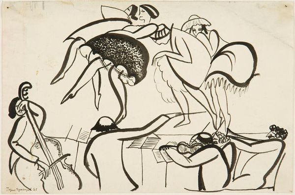 Sorin Ilfoveanu's "Saturnalia" depicts a bacchanal scene of revelry through spare lines and figures, evoking the ancient Roman festival of Saturn. The artist populates the canvas with an ungulate, flutist, and figures with crossed arms. The figures are depicted with an economy of lines, bringing to mind the cave paintings in Lascaux, where animals are reduced to their barest, most recognizable forms. In this work, the bird perched on the figure's head may hearken back to ancient practices of divination, where birds served as messengers between the earthly and spiritual realms. The flutist provides a connection to ecstatic rituals and altered states of consciousness, where music is the vehicle for transcending the mundane. Ilfoveanu masterfully employs a visual language rooted in the past, reminding us that the human experience is a continuum. Through the image's emotional intensity, the artist conjures the enduring echoes of ancient rites and communal celebrations.
