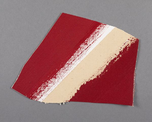 Editor: This is Barnett Newman's "Painted canvas fragment," its date is unknown. It's just a small, irregular piece of painted canvas, mostly red with a white stroke. It feels so raw and elemental. What do you make of it? Curator: Raw is the perfect word! It's like a primal scream distilled into color and form. Newman sought the sublime, that overwhelming sense of awe. Does this fragment evoke that feeling in you? Editor: I think so, the scale is so small, yet the boldness of the red is...striking. Curator: Exactly! Newman challenges us to find the monumental in the minimal, the infinite in the intimate. It is like a whisper that carries the weight of the universe. Editor: It's strange how much feeling can be packed into something so small and simple. Curator: Yes, it's a testament to the power of art to transcend its physical form.