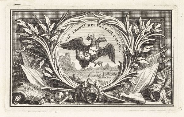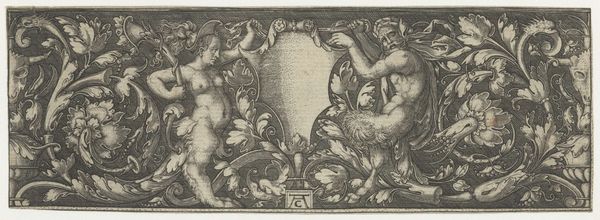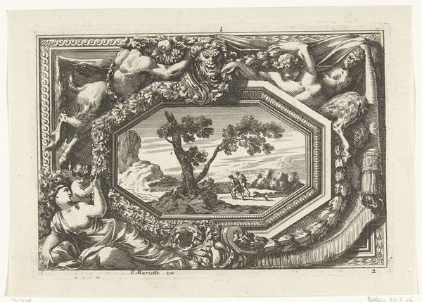Curator: Ah, Jean Lepautre's "Twee halve omlijstingen"— "Two Half Frames"— from around 1656-1706, hanging in the Rijksmuseum. An exquisite example of baroque engraving. I find myself quite drawn to the way Lepautre blends the stark realism of the landscapes with the ornate embellishments. Editor: Yes! It's like… two worlds coexisting, almost bumping into each other. The detail is impressive. What’s striking to me is how these elaborate, almost fantastical frames, surround such a tranquil scene. It’s like a dreamlike garden or forest in miniature. How do you interpret this work, especially given the combination of natural and artificial elements? Curator: That’s a fantastic observation. It's almost as if he’s teasing the divide between raw nature and humanity's desire to categorize, to adorn, to frame. What's especially interesting is the tension between the freedom of the landscapes *within* the frames versus the *containment* they imply. The frames themselves, practically bursting with cherubs and garlands, act as visual anchors, right? And the landscapes—do they seem serene, perhaps even melancholy? Editor: Yes, now that you mention it, the landscapes have this quiet, almost somber tone, despite the busy borders! Curator: Perhaps Lepautre intended to stir questions. Is art an escape from the structured world, or a way to bring order to the chaos? Or maybe… perhaps the landscape inspires the decoration itself! Editor: Hmmm, so the organic inspires the artificial? I love that thought! Thanks for helping me really see this work, the contrasting elements are now much more clear! Curator: My pleasure! These old engravings—they are whispering conversations. Always exciting to uncover what they have to say.