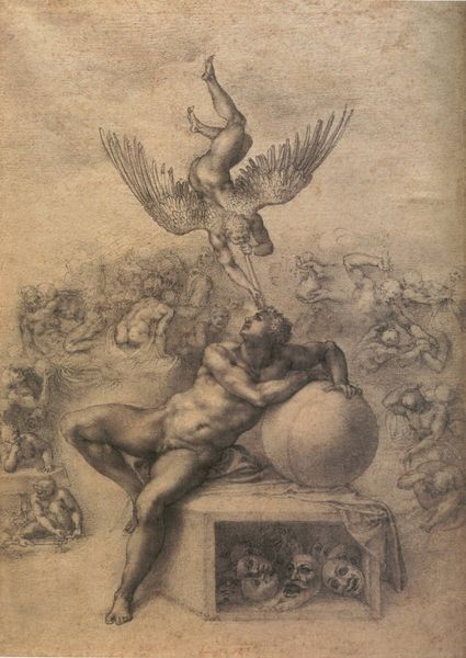 Józef Simmler created this Biblical Composition with pencil on paper; it depicts an angel carrying a male figure into the sky. Angels, divine messengers with wings, are seen across cultures and religions, symbolizing guidance and protection, dating back to ancient Mesopotamian art. Here, the angel’s protective gesture is evocative of the classical motif of 'Psychopomps,' figures who guide souls to the afterlife. The act of carrying the figure upwards might remind us of similar motifs in antiquity. Consider how this reflects earlier depictions of celestial transport, such as Ganymede being carried off by Zeus's eagle, symbolizing immortality, or the ascension of heroes into Valhalla in Norse mythology. These echoes remind us that these images tap into a collective unconsciousness, a deep-seated human desire for transcendence and immortality. The emotional power of being carried to the sky, engaging viewers on a deep, subconscious level, resurfaces in different historical contexts, bearing new meanings.