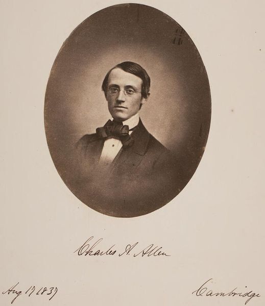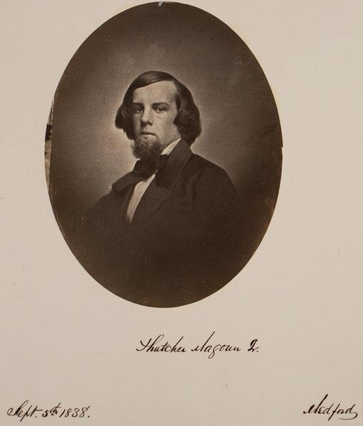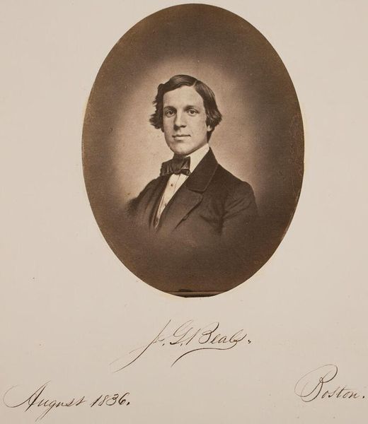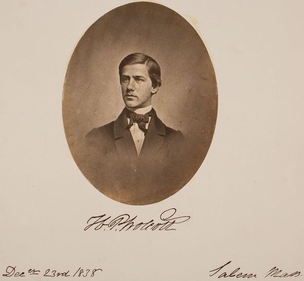Curator: Here we have a portrait by John Adams Whipple, depicting William Pitt Greenwood Bartlett. It is part of the Harvard Art Museums collection. Editor: It feels incredibly intimate, almost as if I'm peering into someone's private world. The oval framing softens the severity that portraiture can sometimes have. Curator: Exactly. Whipple was a pioneer of photography in Boston, and the daguerreotype process gives it that unique sepia tone. He captured a palpable sense of self. Editor: The sepia tones certainly lend a nostalgic air, reminiscent of bygone eras and faded memories. What strikes me is the direct gaze, as though Bartlett is meeting the viewer’s eye across the decades. Curator: And the bow tie! A real statement of individuality. Photography was still relatively new, so choosing how to present yourself to posterity was a powerful act. Editor: It is really a moment frozen in time. Every detail, from the way his hair falls to the tilt of his head, seems significant now. Curator: Precisely. These early photographic portraits offer us such a fascinating window into the past. Editor: Indeed, it sparks curiosity to imagine the untold stories behind that image.