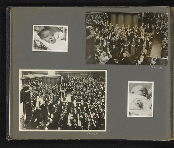 Editor: This is "Kerst 1942," or Christmas 1942, a gelatin silver print. It seems to depict a collage of photographs, all related to a Christmas celebration. The mood is surprisingly jovial, considering the year. What do you see in this piece, especially considering its materiality? Curator: I see a constructed reality, meticulously assembled. Look at how these gelatin silver prints, a relatively accessible medium, have been arranged within what appears to be an album or scrapbook page. It's not just about capturing a moment; it's about the active crafting of a narrative during wartime. The materials themselves speak to a need for normalcy, or perhaps, propaganda. Consider the labor involved in producing, developing, and arranging these photographs—who were they for? Editor: So, the value isn't just in the images themselves, but in the process of creating this physical object? Curator: Precisely. The materiality demands we consider the conditions of its creation: access to photographic supplies during wartime, the purpose of documenting this event, and the act of compiling it into this presented format. What was the societal context and power relationship here in its consumption? Do the photographs show true happiness or forced morale? How would it impact someone to come across such a photograph? Editor: That really shifts how I see it. It’s less about the festive imagery and more about understanding the work involved and what it represents about wartime culture. Thank you. Curator: Indeed. Analyzing the materials opens a window onto the human actions and social forces behind the image itself. Now, let's ponder this in connection to other photographic albums that contain personal pictures…
