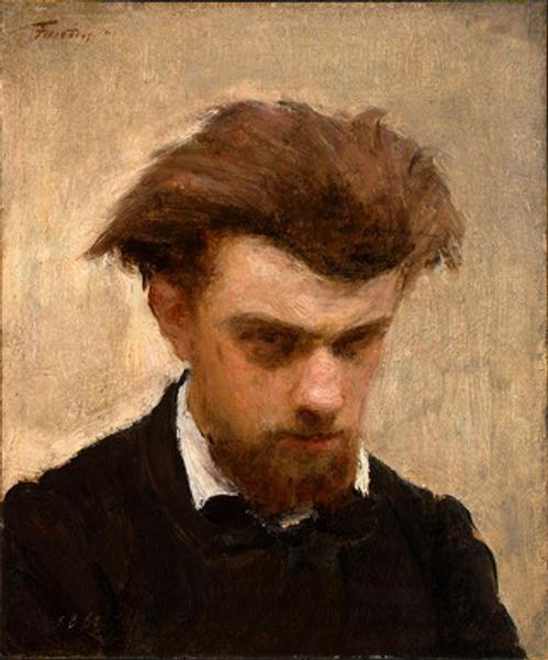 Editor: Here we have Fantin-Latour's "Self-Portrait." It's a smaller piece, but the gaze is intense. What symbols do you see resonating here? Curator: Notice how the artist’s gaze avoids direct engagement, suggesting introspection. The muted palette, the dark clothing, aren't these visual signifiers of the romantic artist as a figure set apart? Editor: Yes, the romantic artist set apart! I like that reading of the symbols. Curator: Consider this: the artist’s self-fashioning becomes a claim on identity, a projected persona laden with cultural meaning. What do you think? Editor: I never considered self-portraits in that way, but it makes sense to imbue it with self-fashioning and cultural meaning. Thanks! Curator: My pleasure! It’s amazing how self-representation can reflect broader cultural currents.