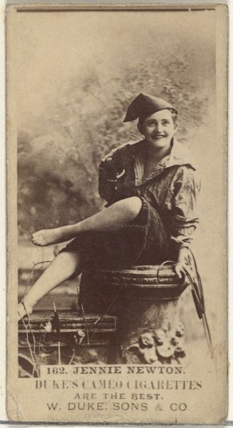 This sepia-toned photograph, likely from the late 19th century and issued by Kinney Brothers, presents an actress in repose. Seated jauntily upon what appears to be a classical column base, she wears a cap reminiscent of those donned by figures of folly and jest. Such a cap carries echoes from the medieval courts where the fool was permitted—even expected—to speak truths otherwise silenced. Consider, for example, the Commedia dell'arte, where characters sported similar headgear, signaling their roles as social commentators and agents of disruption. Here, the actress, through her cap, becomes a conduit for societal expressions, a vessel for the collective mirth and anxieties of her time. But observe how this symbol has shifted. The cap no longer solely signifies the fool; it now adorns a woman, an actress, who uses performance to challenge and entertain. It speaks volumes about the changing roles of women in public life and the stage as a space where identities are fluid, and social norms are playfully interrogated. This simple cap, thus, becomes a potent reminder of how symbols are constantly re-evaluated and redefined by history.