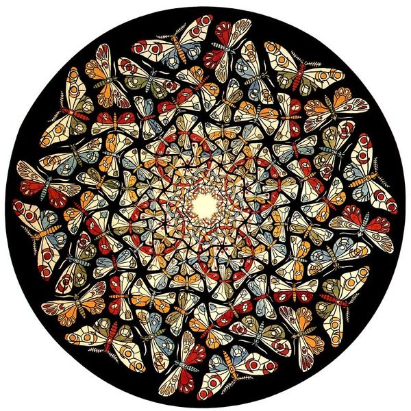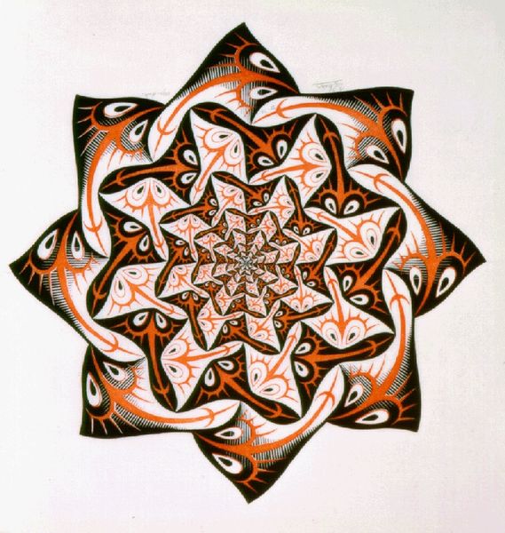Editor: This is M.C. Escher's "Snakes," created in 1969. It's a drawing done with pen, and the swirling pattern gives me a slight sense of vertigo, but I can't stop looking. What stands out to you most when you look at it? Curator: The visual tension, certainly. The snakes, symbols of primal instinct and sometimes of healing, are inextricably linked with the geometric lattice. Don’t you find the weaving pattern almost mandala-like, suggestive of ancient cosmological diagrams? Escher's works often played with impossible realities. Editor: Definitely, I can see the mandala in it! So you’re saying the snakes and the geometric pattern represent two contrasting ideas, instinct versus…order? Curator: Perhaps order is too simplistic. Consider it a struggle between the organic, the serpentine—life itself—and the human need to categorize, to impose a system onto chaos. Look at how the scales are carefully drawn, then juxtaposed against the mathematical precision of the weaving. This creates a fascinating psychological tension. Where does one end and the other begin? Editor: It's a bit unsettling now that you mention the tension, I hadn’t thought of it that way. The pattern felt soothing, but now I feel the push and pull. Curator: Isn't that often the case with powerful symbols? They lull us into a sense of familiarity while simultaneously carrying complex, even contradictory, meanings within. The Ouroboros is referenced, in which a snake is eating its tail: a powerful ancient symbol for constant re-creation, which further supports Escher's genius of his visual continuity. Editor: That’s so interesting. It shows how much symbolism can be embedded in an image even if we don’t consciously register it all at first. Curator: Precisely! Symbols whisper across cultures and time, resonating with layers of meaning beyond immediate perception. It’s about deciphering that visual language.