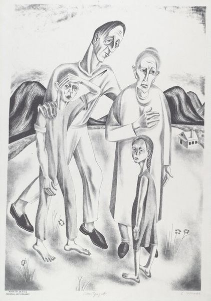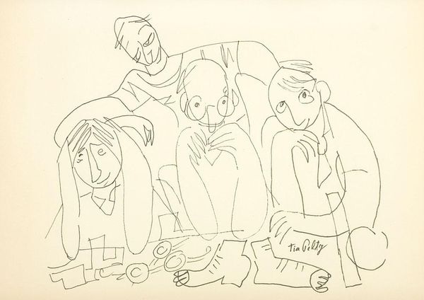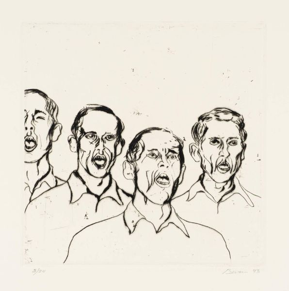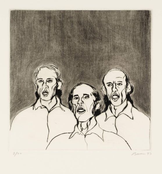 Editor: This is Tony Bevan's 'Group with Dark Background' from 1993. It's a striking print, and the figures are so angular. What compositional elements stand out to you? Curator: The figures, while appearing to occupy a single plane, lack spatial integration. Observe how the dark background, rendered through dense hatching, flattens the image. The subjects, outlined with bold, almost brutal lines, appear disjointed from their environment. Editor: So, it's less about depth and more about the stark contrast? Curator: Precisely. The interplay between the harsh linearity of the figures and the textured darkness behind them is key. Bevan masterfully uses line to create a sense of unease, wouldn't you agree? Editor: I do. I never thought about it that way. Thanks. Curator: A close examination reveals the power of formal elements. It's been a pleasure discussing Bevan's work with you.