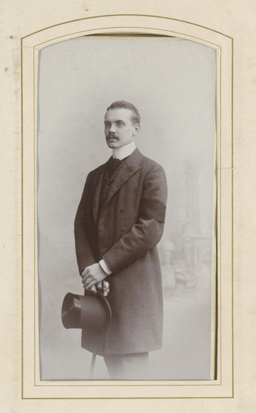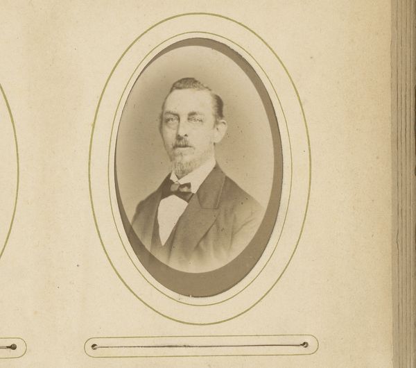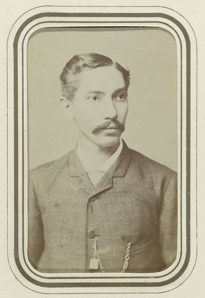 Curator: Today we're looking at a daguerreotype titled "Portret van een man met snor," which translates to "Portrait of a man with a mustache." This photographic print dates from sometime between 1860 and 1900 and captures its sitter with both formality and softness. What strikes you about it? Editor: It feels like a performance, almost theatrical. There's something so staged and melancholic in the way he is posed. The dark suit and background are not really working, but instead convey sadness or even some sort of unease. Curator: Indeed. Let's examine the tonal range; note how the light is captured. There's the strong contrast between the light falling on the sitter's face, highlighting his mustache—certainly a focal point. This use of chiaroscuro, that play between light and dark, really defines the composition, wouldn’t you agree? Editor: Well, it seems the very staging points to ideas of masculinity and societal expectations during the time, you know? A clean-shaven man might signal youth or lower status while sporting the mustache of the moment hints at bourgeois aspiration and patriarchal control. He wants to participate but seems almost imprisoned by it. Curator: An intriguing reading. I would point to the way his suit fits, too. You can observe the detailing of its form, as his expression is relatively relaxed. There’s a tension here—one where, formally, he wants to abide. He may be more constrained than defeated. Editor: His relaxed hand is also a hint about some tension he has given up. Maybe an invitation for new roles for man in this time. The mustache becomes just another boundary crossed as Victorian-era ideals began breaking down around the end of the century, wouldn't you say? Curator: Interesting, indeed! A new vision seems an important takeaway for audiences engaging with this image, perhaps the artist felt that. A detail easily overlooked. Editor: Yes, this helps contextualize not only his presence in history, but the evolving standards for future generations, wouldn't you agree? Curator: Very insightful. Thank you for helping us delve more into this striking image.