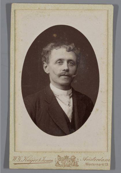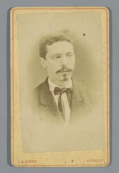 Editor: This gelatin-silver print from the late 19th century, titled "Portrait of an Unknown Man, Referred to as Julius," by Albert Greiner, has a kind of melancholy aura about it, don't you think? What speaks to you most when you look at it? Curator: The figure's meticulous grooming is quite striking, isn’t it? The carefully arranged hair, the neatly trimmed mustache, the elegant bow tie - they are all deliberate markers. Consider how portraiture, especially photography, functioned then. It wasn't just about recording an image, but about crafting an identity, often aspirational. This man, identified as ‘Julius,’ wants to be remembered in a specific way. The objects that define him represent control, wealth, and, of course, power. Editor: So you're suggesting that this portrait isn't just a simple snapshot, but a constructed image meant to convey a certain message? Curator: Exactly. Every element contributes to this carefully constructed visual language. Think about the "unknown man’s" gaze, too: it projects both a hint of vulnerability and direct confidence, an ambiguous emotional tension common to portraiture across the ages. What does it make you think about identity today? Editor: That’s interesting, especially because his identity is, after all, "unknown." It's like he's curating an identity without revealing who he really is. I guess we all do that, in a way, with social media and whatnot. Curator: Precisely! This "Julius", perhaps an alias, reminds us of our perennial human desire to fashion our self-image. I wonder who he was. Editor: I never thought a portrait of an unknown man from the 1800s could be so relevant to today's image-conscious society. Curator: Indeed, it reveals the ongoing power of symbols.