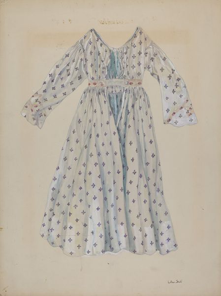 Marie Lutrell created this watercolour painting called 'Child’s Dress'. Predominantly blue, the dress in question fills the frame, its intricate floral pattern drawing the eye closer. The puffed sleeves and gathered waist add volume, contrasting with the stark white background. The dress serves as a signifier, prompting an exploration beyond its surface. Lutrell's focus on detail invites us to consider the cultural codes embedded in clothing. What does it mean to depict a child's garment with such precision, and what cultural values are represented here? The dress’s pattern, though decorative, obscures the very form it adorns, challenging a clear distinction between surface and structure. Notice the way the artist captures the textile's texture through delicate brushwork. This attention to the materiality of the dress functions as a point of entry, inviting further reflection on themes of identity, representation and memory. Luttrell prompts a deeper dialogue about how we construct meaning through art.