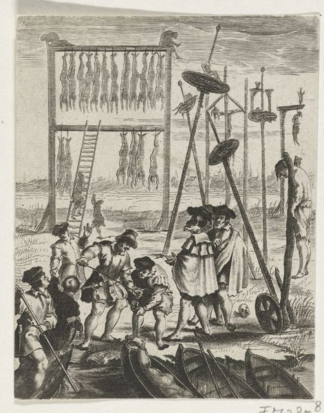This print, titled "Spotprent met de executie van prinsgezinden," was made in 1784 by an anonymous artist using engraving, a process involving carving an image into a metal plate. The incised lines hold ink, which is then transferred to paper. Here, the material and process are crucial in understanding the print’s social context. Engraving allowed for relatively quick and inexpensive reproduction, making it an ideal medium for political commentary. The sharp, precise lines lend a sense of clarity and authority to the image, emphasizing the perceived righteousness of the figures depicted. Look closely, and you’ll see the artist’s detailed rendering of the scene, the figures, and the symbolic elements. The very act of creating and distributing this print was a political statement, reflecting the intense social and political divisions of the time. This artwork challenges traditional notions of fine art, showing us how the processes of making and dissemination can be just as important as the image itself.