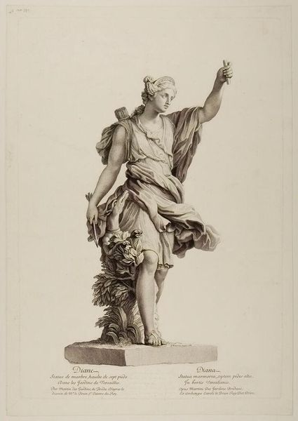 Editor: Here we have a print from somewhere between 1794 and 1828, attributed to Ludwig Gottlieb Portman. It’s titled "Statue of Laurens Jansz. Coster." It seems to be an engraving depicting a statue. I find the limited palette and the artist's use of line to create form really compelling. What compositional elements stand out to you? Curator: The engraving offers a neoclassical composition, quite orderly. The statue of Coster is centrally located. The statue rests on a cubic plinth. The statue displays idealised proportions, echoing the neoclassical obsession with harmony and balance. The artist emphasizes line, particularly in the drapery. Do you notice the interplay of light and shadow and the direction of the light source? Editor: Yes, the light seems to come from above and to the left. The shadows create depth, especially in the folds of the robe, highlighting the figure's form. Is the cityscape relevant or merely background? Curator: The architectural setting does provide context, but observe how it does not compete for visual dominance. Note how the paving stones, though patterned, lead to the more simplified plinth base. This progression guides the eye upwards, underscoring the statue's prominence as the central form. Also consider that its monochrome treatment reduces the background elements' impact on the statue. This promotes a sharp figure/ground distinction to allow us to isolate and study the aesthetic properties of the portrait. Editor: That makes sense; it really draws all the focus onto the statue itself and the artist's skill in rendering it through this printmaking technique. I appreciate seeing the details in the statue and then realizing the landscape and neoclassical influence after analyzing its construction. Curator: Exactly! It's about analyzing how formal choices coalesce to give us the overall work.