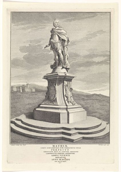 Editor: Here we have a print from somewhere between 1794 and 1828, attributed to Ludwig Gottlieb Portman. It’s titled "Statue of Laurens Jansz. Coster." It seems to be an engraving depicting a statue. I find the limited palette and the artist's use of line to create form really compelling. What compositional elements stand out to you? Curator: The engraving offers a neoclassical composition, quite orderly. The statue of Coster is centrally located. The statue rests on a cubic plinth. The statue displays idealised proportions, echoing the neoclassical obsession with harmony and balance. The artist emphasizes line, particularly in the drapery. Do you notice the interplay of light and shadow and the direction of the light source? Editor: Yes, the light seems to come from above and to the left. The shadows create depth, especially in the folds of the robe, highlighting the figure's form. Is the cityscape relevant or merely background? Curator: The architectural setting does provide context, but observe how it does not compete for visual dominance. Note how the paving stones, though patterned, lead to the more simplified plinth base. This progression guides the eye upwards, underscoring the statue's prominence as the central form. Also consider that its monochrome treatment reduces the background elements' impact on the statue. This promotes a sharp figure/ground distinction to allow us to isolate and study the aesthetic properties of the portrait. Editor: That makes sense; it really draws all the focus onto the statue itself and the artist's skill in rendering it through this printmaking technique. I appreciate seeing the details in the statue and then realizing the landscape and neoclassical influence after analyzing its construction. Curator: Exactly! It's about analyzing how formal choices coalesce to give us the overall work.