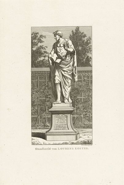 Editor: Here we have a print from somewhere between 1794 and 1828, attributed to Ludwig Gottlieb Portman. It’s titled "Statue of Laurens Jansz. Coster." It seems to be an engraving depicting a statue. I find the limited palette and the artist's use of line to create form really compelling. What compositional elements stand out to you? Curator: The engraving offers a neoclassical composition, quite orderly. The statue of Coster is centrally located. The statue rests on a cubic plinth. The statue displays idealised proportions, echoing the neoclassical obsession with harmony and balance. The artist emphasizes line, particularly in the drapery. Do you notice the interplay of light and shadow and the direction of the light source? Editor: Yes, the light seems to come from above and to the left. The shadows create depth, especially in the folds of the robe, highlighting the figure's form. Is the cityscape relevant or merely background? Curator: The architectural setting does provide context, but observe how it does not compete for visual dominance. Note how the paving stones, though patterned, lead to the more simplified plinth base. This progression guides the eye upwards, underscoring the statue's prominence as the central form. Also consider that its monochrome treatment reduces the background elements' impact on the statue. This promotes a sharp figure/ground distinction to allow us to isolate and study the aesthetic properties of the portrait. Editor: That makes sense; it really draws all the focus onto the statue itself and the artist's skill in rendering it through this printmaking technique. I appreciate seeing the details in the statue and then realizing the landscape and neoclassical influence after analyzing its construction. Curator: Exactly! It's about analyzing how formal choices coalesce to give us the overall work.