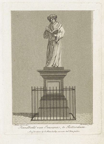 Editor: Here we have a print from somewhere between 1794 and 1828, attributed to Ludwig Gottlieb Portman. It’s titled "Statue of Laurens Jansz. Coster." It seems to be an engraving depicting a statue. I find the limited palette and the artist's use of line to create form really compelling. What compositional elements stand out to you? Curator: The engraving offers a neoclassical composition, quite orderly. The statue of Coster is centrally located. The statue rests on a cubic plinth. The statue displays idealised proportions, echoing the neoclassical obsession with harmony and balance. The artist emphasizes line, particularly in the drapery. Do you notice the interplay of light and shadow and the direction of the light source? Editor: Yes, the light seems to come from above and to the left. The shadows create depth, especially in the folds of the robe, highlighting the figure's form. Is the cityscape relevant or merely background? Curator: The architectural setting does provide context, but observe how it does not compete for visual dominance. Note how the paving stones, though patterned, lead to the more simplified plinth base. This progression guides the eye upwards, underscoring the statue's prominence as the central form. Also consider that its monochrome treatment reduces the background elements' impact on the statue. This promotes a sharp figure/ground distinction to allow us to isolate and study the aesthetic properties of the portrait. Editor: That makes sense; it really draws all the focus onto the statue itself and the artist's skill in rendering it through this printmaking technique. I appreciate seeing the details in the statue and then realizing the landscape and neoclassical influence after analyzing its construction. Curator: Exactly! It's about analyzing how formal choices coalesce to give us the overall work.