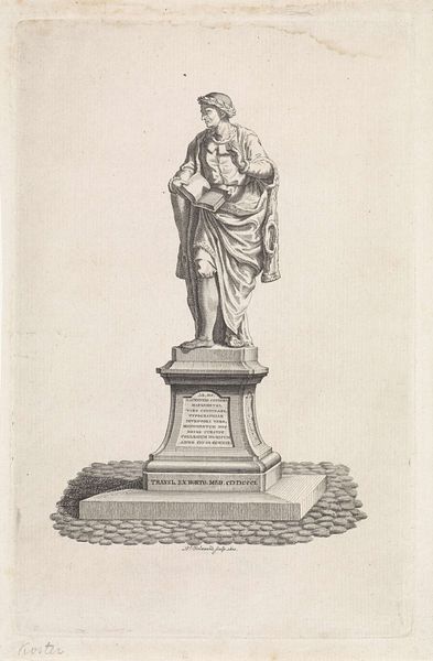 Editor: Here we have a print from somewhere between 1794 and 1828, attributed to Ludwig Gottlieb Portman. It’s titled "Statue of Laurens Jansz. Coster." It seems to be an engraving depicting a statue. I find the limited palette and the artist's use of line to create form really compelling. What compositional elements stand out to you? Curator: The engraving offers a neoclassical composition, quite orderly. The statue of Coster is centrally located. The statue rests on a cubic plinth. The statue displays idealised proportions, echoing the neoclassical obsession with harmony and balance. The artist emphasizes line, particularly in the drapery. Do you notice the interplay of light and shadow and the direction of the light source? Editor: Yes, the light seems to come from above and to the left. The shadows create depth, especially in the folds of the robe, highlighting the figure's form. Is the cityscape relevant or merely background? Curator: The architectural setting does provide context, but observe how it does not compete for visual dominance. Note how the paving stones, though patterned, lead to the more simplified plinth base. This progression guides the eye upwards, underscoring the statue's prominence as the central form. Also consider that its monochrome treatment reduces the background elements' impact on the statue. This promotes a sharp figure/ground distinction to allow us to isolate and study the aesthetic properties of the portrait. Editor: That makes sense; it really draws all the focus onto the statue itself and the artist's skill in rendering it through this printmaking technique. I appreciate seeing the details in the statue and then realizing the landscape and neoclassical influence after analyzing its construction. Curator: Exactly! It's about analyzing how formal choices coalesce to give us the overall work.