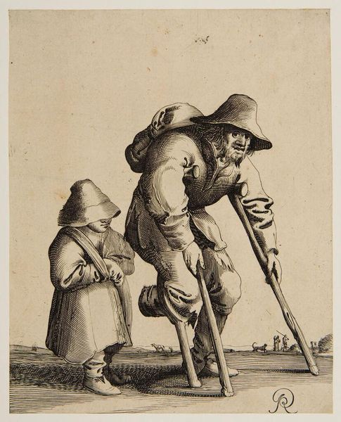 Curator: Pieter Jansz. Quast, who lived from 1606 to 1647, created this piece, titled "Two Men Leaning on a Stick." Editor: It feels like a stage play about to begin! There's a sense of anticipation, or maybe just plain weariness, radiating from these figures. Curator: Quast was a Dutch Golden Age painter and printmaker known for his genre scenes, often depicting peasants and soldiers. This work seems to fit squarely within that tradition. Editor: The detail in their tattered clothes is remarkable—almost tender. You can practically feel the texture of the rough cloth and imagine the dust kicked up on the road. Curator: His pieces really tap into social commentary with a touch of humor, showing the everyday lives of ordinary people with all their flaws and quirks. Editor: I love how they’re connected by that stick, yet utterly disconnected from each other. Each lost in their own thoughts. Curator: Quast captured a shared moment of reflection, maybe even resignation. Editor: It makes you wonder about their stories, doesn't it?