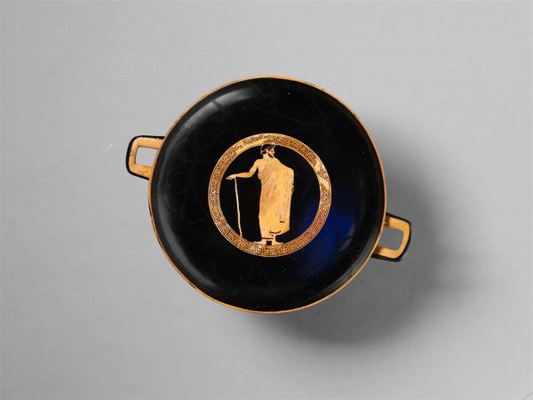 This is a terracotta kylix, or drinking cup, by Hieron, currently held in the Metropolitan Museum of Art. At first glance, the drinking cup is characterized by the contrast between the black background and the reddish figures at its center. This visual opposition immediately directs our attention to the kylix's interior where two figures are captured in silhouette against the light terracotta. The composition within this circular space, framed by a meander pattern, suggests a dance or ritual, perhaps alluding to the cup's function in convivial or ceremonial settings. The dark ground of the kylix, achieved through a sophisticated firing process, creates a void-like space that accentuates the figures. This play between positive and negative space is not merely decorative; it invites us to consider how form and absence can create meaning. The kylix, in its structural elegance and semiotic charge, embodies the complex interplay between aesthetics, functionality, and cultural expression in ancient Greek society.